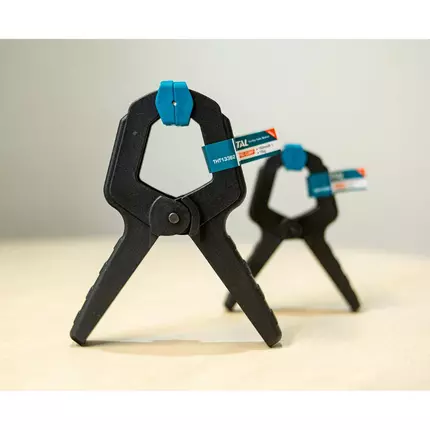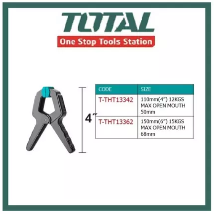 Offering an exceptional mix of modernity, design, ease of use, great range and competitive pricing, TOTAL TOOLS stands out from the crowd. So much so, TOTAL is one of the fastest-growing Tools Brand. Specifications: Brand: Total Model: THT13362 Hand tools Type: Spring Clamps Size: 6" Length: 150mm Clamping Force: 15kg Max Open Mouth: 68mm Colour: Black Weight: 0.50 kg Black clip body Packed by label