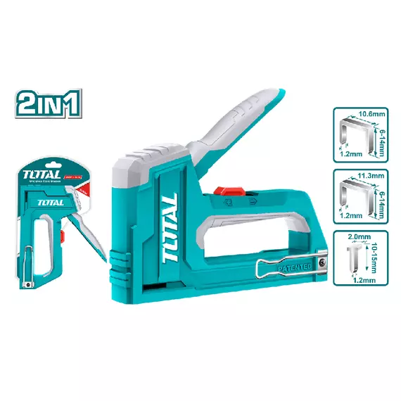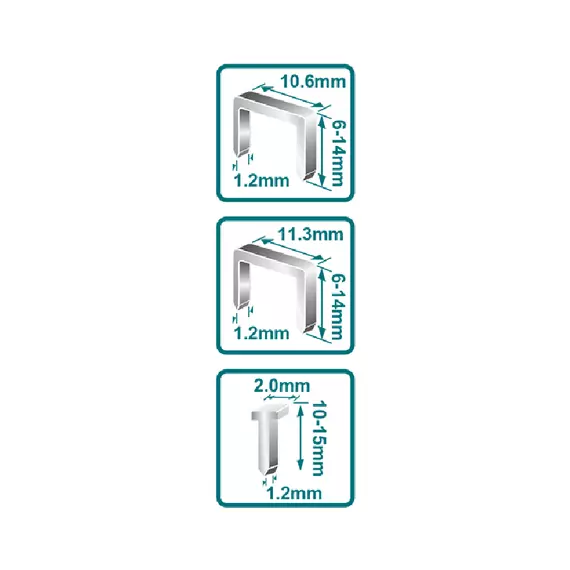 Specifications: 2 in 1 staple gun high/low power switch Staples Wire: 1.2mm,crown: 10.6mm,length:6-14mm Wire: 1.2mm,crown: 11.3mm,length:6-14mm Brad nails Wire: 1.2mm,head size:2mm,length:10-15mm With 500pcs staples/500pcs brad nails Matched with staple items: tht3982,tht39102,tht39122 and brad nails:sts6110 Packed by double blister