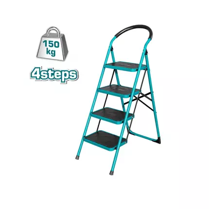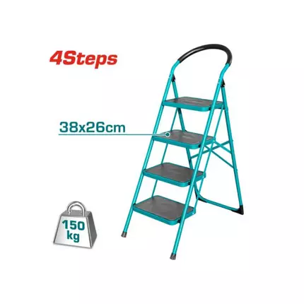 4-step ladder is used for various work at height. The non-slip base ensures the stable position of the ladder and ensures comfortable use. It is compact and easy to store. Specifications: Brand: Total Model: THLAD09041 Type: Ladder Material: steel Steps: 4 Steps Step size: 380*260mm Open Size: 830*490*1290mm Max.Load: 150kg Packed by carton box