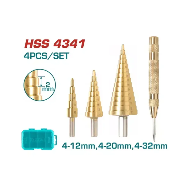 This Total TACSD2041 set provides a complete solution for precise drilling in sheet metal, plastic, and wood. It combines three versatile step drill bits with an automatic center punch for accurate hole starting and clean, burr-free enlarging.