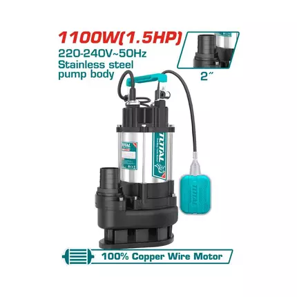 Specifications: Brand: Total Model: TWP7110016 Type: Water Pump Voltage:220-240V~50Hz Rated power:1100W(1.5HP) Max.head:15m Max. flow:366L/min Pipe diameter:2" Copper wire motor Pump body:Stainless Motor body:Cast iron 9m length cable For dirty water Packed by wooden box