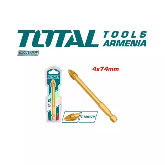 Specifications: Brand: Total Model: TACG210412 Type: Drill Bit Drill diameter: 4mm Length: 74mm High quality carbide tip Packed by Double blister.