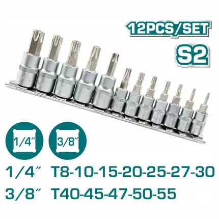 Set of nuts with from Total with socket size 1/4'', 3/8'', for connection with a corresponding size socket, in a ratchet or handle. One of the necessary accessories to achieve a stable and strong result in applications such as tightening or loosening screws. Specifications: Brand: Total Type: Torx Bit Socket Set Bit Material: S2 Socket Material: 50BV30 Heat Treatment Finish: Chromed Plated Packaging: Shrink Wrap Set Includes: 5 Pieces 3/8" Drive Bit Socket: T40, T45, T47, T50, T55 7 Pieces 1/4" Drive Bit Socket: T8, T10, T15, T20, T25, T27, T30