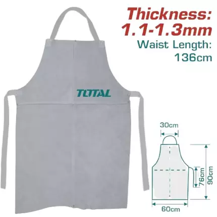 Specifications : Brand: Total Type: Leather Welding Apron Size: 90 x 60 cm Material: Leather Function: Effectively protects the front part of the body from welding spatter Packaging: Poly Bag