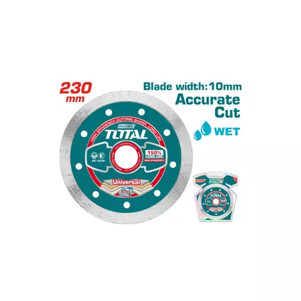 Specifications: Brand: Total Model: TAC2122301 Type: Wet Cutting Disc Size: 230(9″)X22.2mm Blade width:10mm Packed by double blister For Cutting: Stone, Concrete, Brick, Granite, Marble Suitable for Wet Cutting