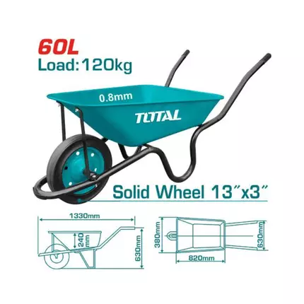Specifications: Brand: Total Model: THTWB380008 Type: Wheel Barrow Load (kg): 120kg; Water Capacity(L): 60L; Sand Capacity(CBF): 4CBF; Wheel: 13" x 3",Solid Wheel, L*H*A*B*C(mm): 1330*630*820*380*630 Tray with 0.8mm thickness Handle with 1.2x32mm Packed by bulk