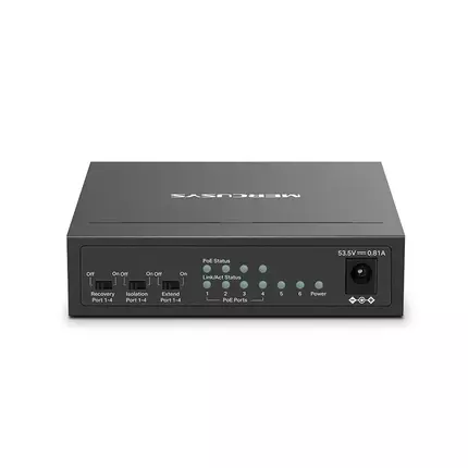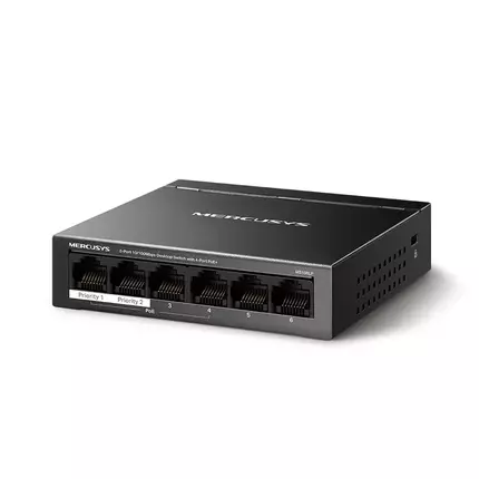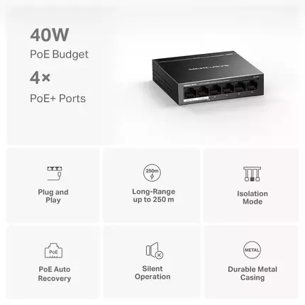Tp Link 6-Port 10/100Mbps Desktop Switch with 4-Port PoE+ MS106LP 6 Ports: 6× 10/100 Mbps RJ45 ports with 4 PoE+ ports Two Cables in One: With four PoE+ ports, transfers data and power on one single cable High Power PoE+: Support PoE Power up to 30 W for each PoE port and 40 W for all PoE ports* 2× Uplink Ports: MS106LP provides 2× uplink ports when turning on the isolation mode. One for connecting to the Internet and one for connecting to the NVR. Long-Range up to 250 m: Increases PoE transmission distance to 250 m by Extend Mode* Isolation Mode: One click to divide traffic for specific ports for stability and security Compliant with Powered Devices: Works with IEEE 802.3af/at compliant PDs Durable Metal Casing: Allows for efficient heat dissipation and long network life Plug and Play: Simple to use and saves time and effort PoE Auto Recovery : Automatically reboots your dropped or unresponsive PoE-powered devices Power over Ethernet: Two Cables in One No Fuss No need for electricians; simplify installation and deployment. Cost-Efficiency Getting rid of extra cables and power adapters will save money on infrastructure. Flexibility Deployment in complex situations is made possible by more placement possibilities. Power Management Improves power usage while intelligently protecting your gadgets from power surges. IEEE 802.3af/at PoE ports compliant with the 802.3af/at Powered Devices. Traffic Separation With only one click, isolation mode divides traffic for ports 1-4 to prevent snooping/tampering and isolate broadcast storms for greater protection. MS106LP provides 2× uplink ports when turning on the isolation mode. Port Prioritization Prioritizing the data of specific ports would ensure the high quality of delicate applications, such as voice and video, in crucial business domains. PoE Auto Recovery The switch continuously detects data transmission with PoE-powered devices (PD). When a PD stops sending data packets to the switch for an extended length of time, the switch will reboot it automatically. Plug and Play MS106LP offers auto-negotiation (10/100M) and automated MDI/MDIX. There is no additional configuration needed. It is simple to use and saves time and effort. Durable and Silent MS106LP's durable metal case allows for efficient heat dissipation, excellent signal interference prevention, equipment stability, and long network life. PoE budget calculations are based on laboratory testing. Actual PoE power budget is not guaranteed and will vary as a result of client limitations and environmental factors. The speed of the ports in extend mode will downgrade to 10 Mbps. The actual transmission distance may vary due to power consumption of PoE-powered devices or the cable quality and type.