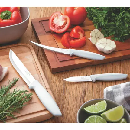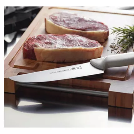 Quality and durability for hardworking professionals. With cuttingedge technology, Tramontinas professional knives are always ready to jump into action and do beautifully well with any ingredient, cut, or recipe. Efficiency all-around. The incredible high quality of the blades is a result of a thermal treatment which consists of hardening (heating the blade), subzero (cooling from 50 to -196 degrees), and tempering (increasing the steel elasticity) for a longer and more efficient life. The anatomical and ergonomic textured polypropylene handle, is directly injected on the steel bolster, ensuring a comfortable, safe use. The antimicrobial protection prevents and reduces the growth of bacteria and fungi. This technology is incorpotated during the handle manufacturing process and lasts throughout the product's life, but it does not eliminate the need to clean it thoroughly.