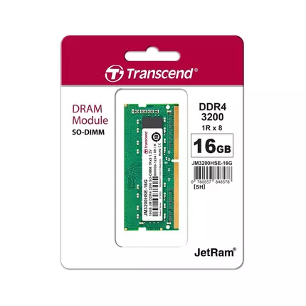 Transcend's JetRam memory modules are manufactured with true ETT grade, brand-name DRAM chips that have passed Transcend's strict screening process and testing. The modules provide excellent compatibility and fully-tested reliability, which is ideal for PC upgrade at an attractive price. Each memory module is rated at 3200 MT/s to greatly increase data transmission efficiency by higher bandwidth of up to 25.6GB/s. Operated at a nominal voltage of just 1.2V, Transcend's DDR4 SO-DIMM JetRam memory ensures that both operating temperature and electrical load on the memory controller can be reduced in order to save up to 40% of energy compared to standard DDR3 modules offering 1.5V. Specifications DRAM Module RAM Type: DDR4 DIMM Type: Unbuffered SO-DIMM Speed: 3200 CAS Latency: CL22 Capacity: 16GB Rank x Org.: 1Rx8 Component Composition: 2Gx8 Voltage: 1.2V Pin Count: 260 pin PCB Height: 1.18 inches Operating Environment Operating Temperature: 0°C (32°F) ~ 85°C (185°F)
