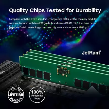 Compliant with JEDEC international standards, Transcend's new-gen DDR5 JetRam memory modules are manufactured with true ETT grade, brand-name DRAM chips that have passed Transcend's strict screening process and rigorous environmental testing. DDR5 features two independent 32-bit channels that bring speeds to 5,600 MT/s. 1.1V low working voltage and PMIC effectively reduce signal interruption while cutting down power consumption for your computer. On-die ECC automatically spots and corrects data errors, enhancing data integrity and system stability. Specifications: RAM Type : DDR5 DIMM Type : Unbuffered Long-DIMM Speed : 5600 MHz CAS Latency : CL46 Capacity : 8GB Rank & Organization : 1Rx16 Component Composition : (1Gx16) x4 Voltage : 1.1V Pin Count : 288 pins PCB Height : 1.23 inche Operating Environment Operating Temperature: 0°C (32°F) ~ 85°C (185°F)