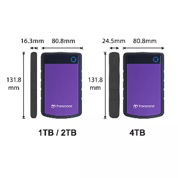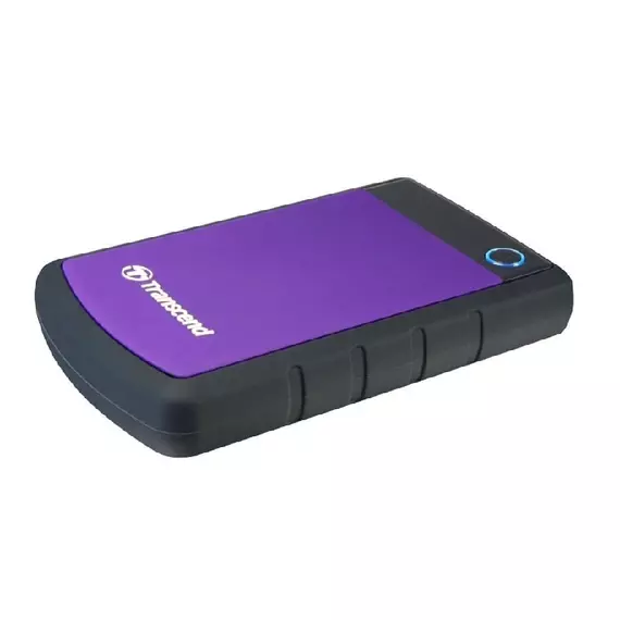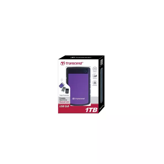 Rugged and portable The StoreJet 25H3 portable hard drive was designed with high endurance in mind. The ruggedized case and the anti-slip texture allow you to store and share wherever you go. Two color options, navy blue and purple, make for a stylish, trendy storage experience! Excellent anti-shock protection The StoreJet 25H3 features a three-stage shock protection system that has passed MIL-STD-810G US military transit drop test to fully protect data stored on the drive. The three-stage shock protection system includes a silicone rubber case, an internal shock-absorbing suspension damper, and a reinforced hard casing. USB Type-A supported. Durable and reliable. The StoreJet 25H3 portable hard drive utilizes a USB Type-A connector that has undergone 10K plug-unplug tests. High durability means extra protection for your files. Lightning-fast transfer speeds The StoreJet 25H3 external hard drive is equipped with the USB 3.1 Gen 1 interface, providing lightning-fast transfer rates of up to 5Gbps. Large capacity. Save all you want. With up to 1TB of storage capacity, the StoreJet 25H3 is well suited for Mac and Windows users to save high-quality photos and videos, or a large number of documents. High capacity and compatibility make this a convenient storage solution! One touch auto backup The StoreJet 25H3 is equipped with a one touch auto-backup button that instantly backs up your data with just one press. The button also enables you to reconnect the hard drive to your PC without the need to unplug and reinsert it. Extreme protection, advanced security. Transcend’s storage devices provide an exclusive disk lock and security function. With Transcend Elite software, you can protect your entire drive and the files inside, meeting the high standard of information security. Features: USB 3.1 Gen 1 interface Three-stage shock protection system that meets US military drop-test standards Convenient one-touch auto-backup for instant data backup Up to 1TB storage capacity Ruggedized and reliable