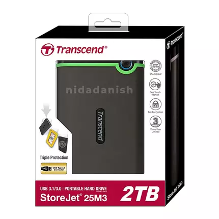 Specifications: Compatible Devices: Desktop Connectivity Technology: USB Digital Storage Capacity: 2 TB File System FAT32 Hard Disk Description Portable Military-grade shock resistance, SuperSpeed USB 3.0 compliant and backwards compatible with USB 2.0 Advanced 3-stage shock protection system, Durable anti-shock rubber outer case Advanced internal hard drive suspension system, Quick Reconnect Button - re-enable safely removed USB hard drive without unplug and reinsert One Touch Auto-Backup button, 256-bit AES file & folder encryption, Exclusive Transcend Elite data management software