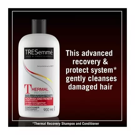 Daily heat styling can put hair through a lot, causing it to become brittle. TRESemme Thermal Recovery Heat Damaged Hair Conditioner deeply moisturizes to replenish heat damaged hair and strengthen styled hair. This thermal protection conditioner with aloe vera and almond extract helps to restore essential nutrients for vibrancy and shine, and is ideal for those who regularly heat style their hair. Thermal Recovery Conditioner is suitable to protect all hair types from heat damage.