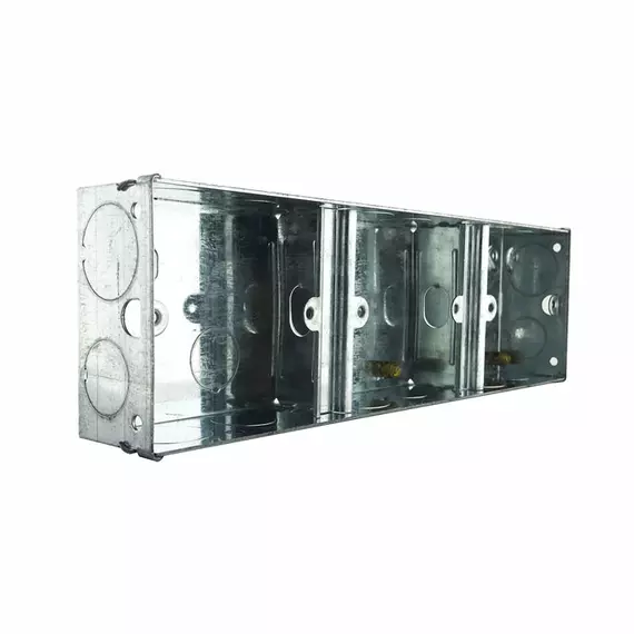 Galvanised Iron switch box are designed to be used within the wall . This means that recessed mounted boxes and are required to be installed into the wall, the walls do need to be chased or chiselled to fit it in. Specification: Colour: Silver Item Dimensions: H 76mm x W 228mm Installation: By qualified personnel Material: Aluminium Application: Used in the wiring and fitting of switches and sockets.