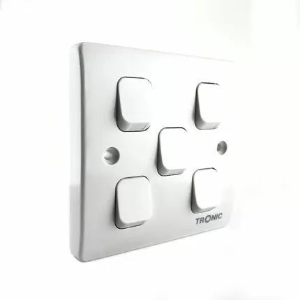 This standard range Tronic 5 gang 2-way switch in white has smooth-edges that fit into the modern style of ones home or offices. 2-way switch/switching means there can be more than one place you can turn your light/s on or off while gang refers to the number of switches. It is suitable for both domestic and commercial applications. The dimensions for this product measure at 90mm x 90mm (H x L). Specification: Color : White Current : 10A Voltage : AC 220-240V Dimensions : H 90mm x W 90mm Material : Bakelite Installation : Fully Assembled Application : Living Room and Bedroom