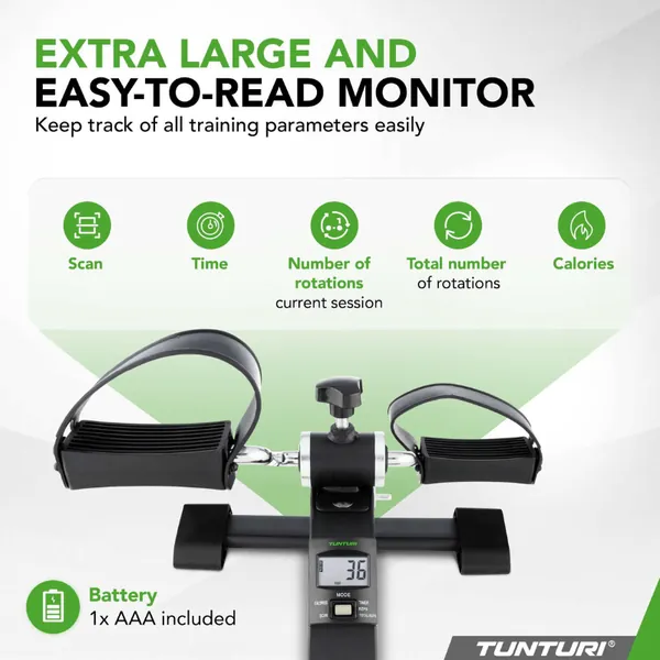 A unique feature of the Tunturi Mini Bike Pro is the built-in monitor. This gives you a clear overview of your training data, such as calories, time, repetitions and total repetitions. The monitor is easy to operate with one button and provides all the information you need to track your performance and achieve your goals.