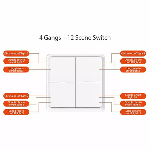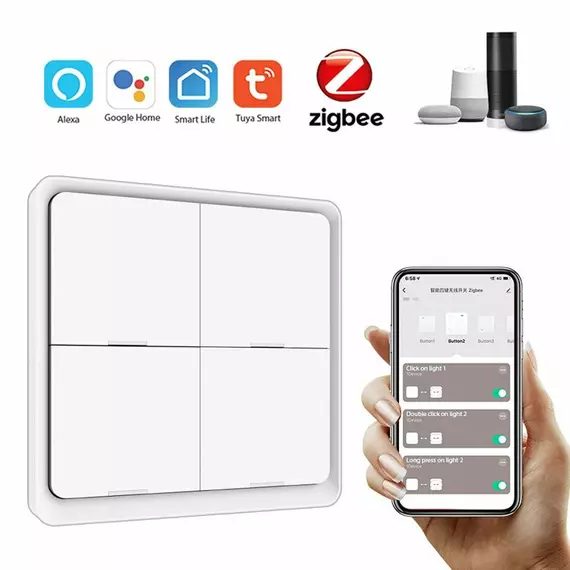 4 Gang Tuya ZigBee wireless 12 scenes switch mechanical button controller battery-powered smart home automation scenario switch Tuya for smart devices Main Features: 1. Smart life App automates Tuya ZigBee wireless scene switch smart to set various scenes for smart life. Tap to get an easier control so that tuya has a key on the switch of smart devices. Each switch button can meet multiple needs, Realizing different scenes. Imagine smart connection to create an endless space with wire stage switch. Note: ZigBee hub required to add the switch for normal use. 2. Three pairing modes for each button, remote mode, home mode, movie mode, etc. To get 12 props from a 4 gang scene switch-like. Start your another smart lifestyle to create any smart automation as you like in your smartphone app, no more voice commands needed, no more time to open your app, just one tap needed, when tired of a day's work. 3. Compact magnetic design: a wireless wall switch when attached to the wall, a remote control when not connected. Due to its compact size of only 1.3cm thick, it can be conveniently carried to the balcony, bedroom, kitchen and more. 4. Can be used in multiple scenes with smart devices: speed up smart device response time, provide more fluid control, remove dependency on only one WiFi network. 5. Fix it anywhere you want with double-sided tape; Low power consumption with 730 days of battery life; No wires required for simple operation, easily set up multiple controls to perform quick and easy upgrades. Note: smart connection to tuya smart devices for normal use only, tuya can not be used alone without smart devices.