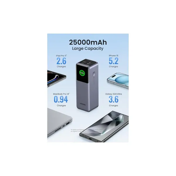 25,000mAh Capacity: UGREEN 25000mAh power bank fully charges MacBook Pro 16" up to 1.3 times, iPhone 15 up to 5.2 times and Galaxy S23 Ultra up to 3.6 times. 90Wh airline-approved capacity is ideal for carry-on, keeping your global travel full of energy.