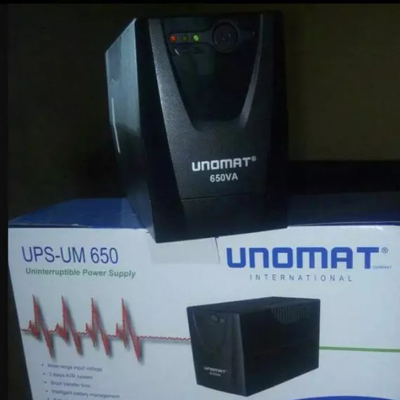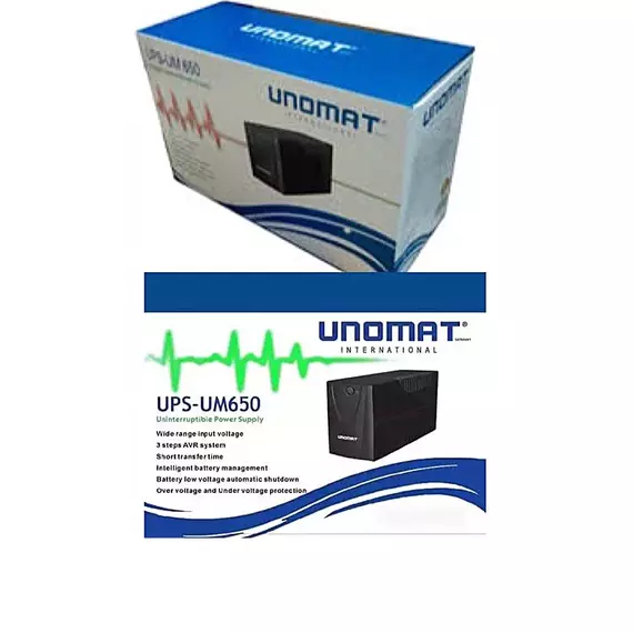 Features Model number: Unomat 650VA UPS Capacity: 650VA Input AC170~280VAC 50Hz Microprocessor Controlled Overload and output short circuit protection Automatic voltage protection Battery recharge time : 8 hours up to 90% capacity