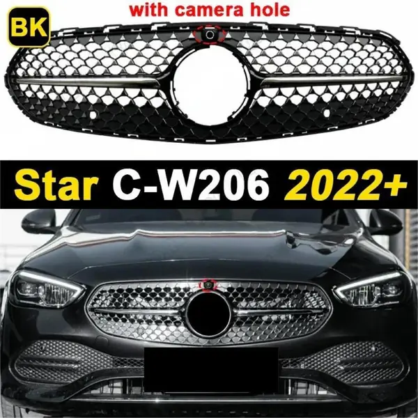 COMPATIBLE WITH MERCEDES BENZ C CLASS W206 C206 2023 UPGRADED FRONT BUMPER RACING MESH SHOW GRILLE WITH CAMERA HOLE DIAMOND BLACK