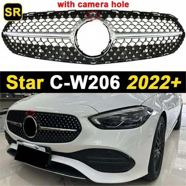 Upgraded Front Bumper Racing Mesh Show Grille With Camera Hole Diamond Silver CC-7256 Compatible With Mercedes Benz C Class W206 C206 2023