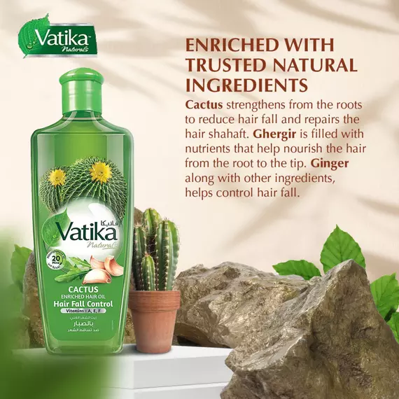 Exposure to harsh elements and hair treatments weakens the hair from the roots thereby increasing hair lossVatika Cactus Enriched Hair Oil contains the nourishing extracts of Cactus, Garger & Garlic which gives your hair and scalp complete nourishment thereby helps control hair fall.