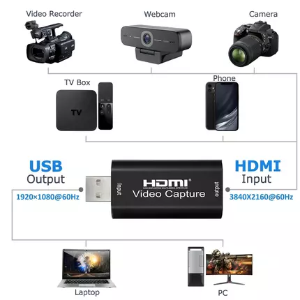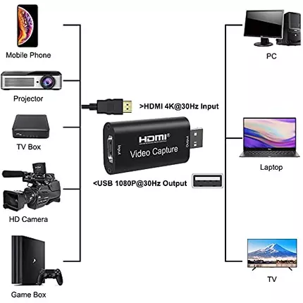 The video capture can capture both HDMI-compatible video and HDMI-compatible audio, sending audio and video signals to computers and smart phones for preview and storage. Suitable for high definition acquisition, teaching recording, medical imaging, etc. Features HDMI Video Capture - This USB 2.0 capture card can collect HDMI audio and video. HDMI audio and video signals can be transmitted to the computer and smart phone for preview and storage. Suitable for high-definition acquisition,teaching recording,medical imaging.Game live streaming, self-media video,etc. Make your life fun. It weighs only about 40 grams, providing you with great portability, allowing you to live broadcast anytime, anywhere, and share your life. HIGH DEFINITION 1080P 30fps - Video capture-support the maximum input resolution of 4K 3840*3160@30HZ, support the maximum output resolution of 1080 1920*1080@30HZ. When using standard AWG26 cable, the maximum input transmission distance is 15 meters (1080p and below resolution). And let you enjoy the digital world with perfect video and audio synchronization. Compatibility - Support most acquisition software,such as VLC, OBS, Amcap, etc. Support Windows: Android, MacOS, etc. Comforms with USB video UVC specification. Comforms to USB audio UAC specification. No external power supply required,small size and easy to carry. Enjoy the smooth capture process and start a new journey! HDMI game capture - With high-speed USB 2.0 technology, you can capture high-definition HDMI video and HDMI audio signal channels, and send game audio and video signals to computers and other devices. Provide you with an excellent game live broadcast experience, suitable for game live broadcast. When you are playing live games, there is no delay when using the HDMI port, which is very useful. Without taking up valuable space on other ports. Specifications: HDMI-compatible resolution : Max input resolution can be 3840×2160@30Hz Support video format: 8/10/12bit Deep color Video output format : YUV,JPEG Video output resolution : Max output resolution can be 1920×1080@30Hz Support audio format : L-PCM Input cable distance .: ≤15m,AWG26 HDMI-compatible standard cable (1080P and below resolution) Support most acquisition software, such as VLC,OBS ,Amcap, etc; Support For Windows,For Android and For MacOS; Conform to USB Video and UVC standard; Conform to USB Audio UAC standard; Without external power supply, compact and portable. Max working current : 0.4A/5VDC Operating Temperature range : (-10 to +55℃) Dimension (L x W x H) : 64x28x13 (mm) Note: Computer hardware configuration requirements CPU: for PC i5-3400 or above ;NB i7-3537U 2.0GHZ or above Graphics card: PC NVIDIA GT630 or above;NC NVIDIA GT735M or above Run memory: 4G RAM Connection and Operation Connect the UHD signal source to the HDMI-compatible input of the video capture withone HDMI-compatible cable Connect the computer to the usb port of the video capture with usb cable. Operation steps for USB video capture(OBS): Open the software→Choose sources of "Video capture Device"→Set the size of image→Choose "Studio Mode"(double window) →Choose "Start Recording"