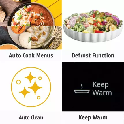 Key features Auto-cook Menu's Express Cooking 5 Power Levels Auto Clean AUTO-COOK MENUS Auto Cook recipe menus to delight your family. EXPRESS COOKING The express cooking feature enables quick cooking/reheating at maximum power, at the single touch of a button. 5 POWER LEVELS Choose from 5 different power levels to set your cooking time. Specifications: Microwaves Details Capacity (L): 23 Oven Type: Solo Special Accessories Starter Kit: No Grill Rack: No Glass Turntable/ Turntable Support: Yes Steam Accessory: No General Information Product Type: Solo Microwave In The Box Contents: Microwave, Turntable, User Manual Installation Type: Freestanding Interior Details Turntable Material: Glass Turntable Diameter (Cm): 24.5 Cavity Material: Superior Powder Coated Color: Black Finish: Steel Exterior Details Door Type: Side Swing Display Type: LED Control Type: Feather Touch Membrane