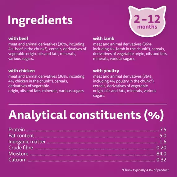 Feeding recommendation: 1 sachet can be replaced with 18 g of WHISKAS® dry food. Consider the calories that come from snacks. Feeding amounts are intended as guidelines only. Adjust the feeding amount according to your kitten's age, size and activity level. Spread feeding portions throughout the day. For more detailed information please visit our website. Provide fresh drinking water. Please serve at room temperature. Store leftover food in a cool place for a maximum of 2 days.