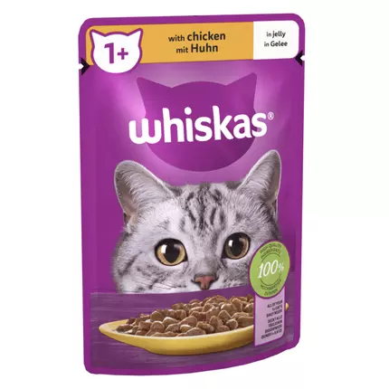 WHISKAS® 1+ chicken adult cat food pouches in jelly are specially prepared to preserve the natural goodness and deliciousness of high quality ingredients and will see your cat rush to the bowl faster than ever before! Made with sustainably sourced ingredients, these cat food pouches contain everything your cat needs to keep them happy and healthy.