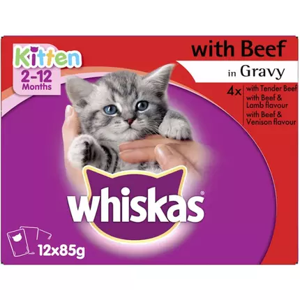 WHISKAS Kitten 2-12 Months Wet Cat Food with Beef in Gravy 48 X 85g Pouches is specifically developed to provide your kitten with the very best start in life.