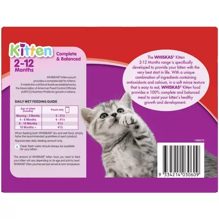 - WHISKAS Kitten wet cat food pouches are carefully prepared to give your kitten the nutrition they need up to the age of 12 months.
