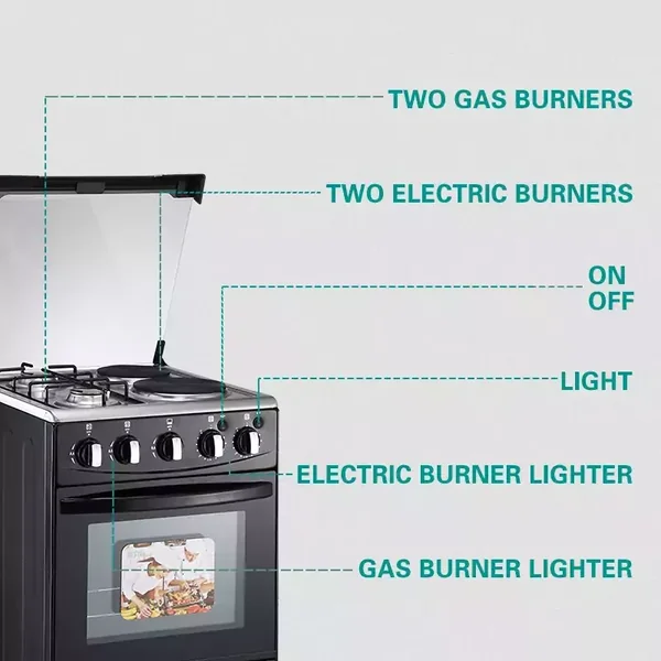 - Hob Configuration: 2 Gas Burners, 2 Electric Hotplates