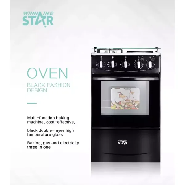 The Winning Star Freestanding Cooker combines gas and electric cooking in a versatile, space-saving design, perfect for home use. This black cooker features two gas burners and two electric hotplates, paired with a spacious 52L oven for all your baking and roasting needs.