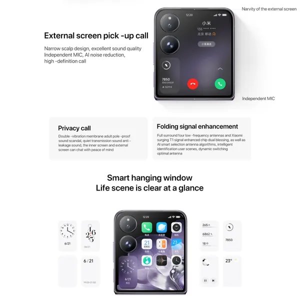 The Xiaomi MIX Flip excels in call quality both when open and closed. It features a dual dipole speaker system for clear audio, whether you’re using the phone in private mode or not. The phone’s advanced antenna design and signal enhancement chip ensure strong connectivity, while an independent noise-canceling microphone near the hinge enhances call clarity.