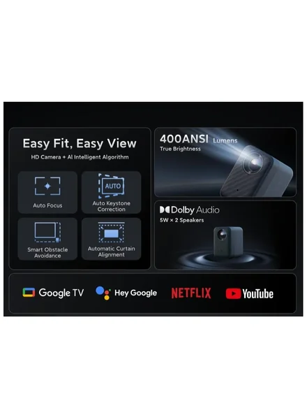 The fully-sealed optical engine adopts a high-definition optical lens featuring excellent light transmission, projecting clearer images with high colour accuracy to reproduce the true artistic beauty of films. With ISO standard effective luminous flux certification, it boasts a brightness of up to 400 ISO lumens, ensuring accurate brightness representation and more visible details. Adopts 1080p HD resolution with fine picture quality and true colour output. Supports 4K video playback with even more details. With a 1.21:1 throw ratio, you can project a large screen ranging from 40 to 120 inches wherever you are. Omnidirectional automatic keystone correction-Project a rectangular image with ease Auto-focusing-Instantly clear images Automatic obstacle avoidance-Instantly present the whole image Auto screen alignment-Quick identification for precise projection