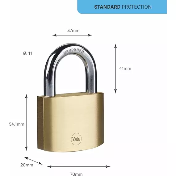 Features: SUITABLE FOR INDOOR USE: Help you protect stairs, garages or other items to protect inside. STANDARD SECURITY: Protect your items with a brass padlock with double locking system, hardened steel long shackle to prevent cutting and a 5-pin cylinder RIGOROUSLY TESTED: Tested to EN12320:2012 with a CEN score of 2 to simulate attack forms such as cutting, twisting and arc pull. Also tested up to 96 hours for corrosion resistance to ensure protection against the elements. Dimensions: Body width 70 mm / Body height 54.1 mm / Body depth 20 mm / Arc diameter 11 mm / Weight 610 g EXCLUSIVE YALE DESIGN: A full range with other sizes and arc lengths to meet your safety needs. Specifications: Model No.: YE1/70/137 Finish: YE1 Essential Series 70mm Standard Shackle Padlock Body Width: 70mm Product Dimensions: 70 x 37 x 39mm Security Grading: 1 - 2 Corrosion Rating: Indoor No. of Padlock: 1 pc Item Weight: 571g No. of Pin: 3 Pins No. of Key: 3 pcs of Nickel-Plated Brass Keys (One key fits all)
