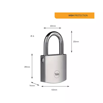 Features Suitable for outdoor use : secure your shed, garden gate, roller shutter doors, or other high-quality items that need to be secured outdoors. HIGH PROTECTION: 5-pin brass cylinder padlock with boron shackle to prevent cutting, and double locking for extra security. Rigoros tested: tested according to EN12320:2012, simulating attack shapes such as cutting, pulling, and twisting of the shackle. Also tested for corrosion resistance for up to 240 hours to ensure weather protection with a CEN rating of 2. Exclusive Yale design: with a choice of sizes from 40 mm to 70 mm for every safety need. Specifications Brand: Yale Special features: Unlock key Lock type: Keypad Item dimensions LxWxH: 14 x 40 x 39 millimeters Material: Brass Finish: Silver