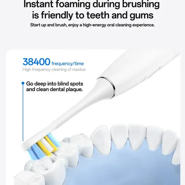 【High-Frequency Vibration】38,400 vibrations per minute ensure thorough cleaning, effectively removing plaque while being gentle on teeth and gums.