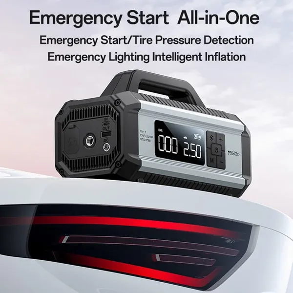 【Versatile 5-in-1 Device】This multi-functional car air pump doubles as a jump starter, power bank, tire inflator, and emergency light, making it an essential tool for every vehicle owner.