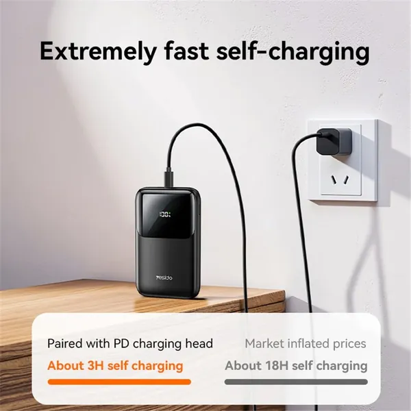 YESIDO YP84 10000mAh Power Bank Digital Display 22.5W Fast Charging Portable Phone Charger with Built-in Type-C 8Pin Cable
