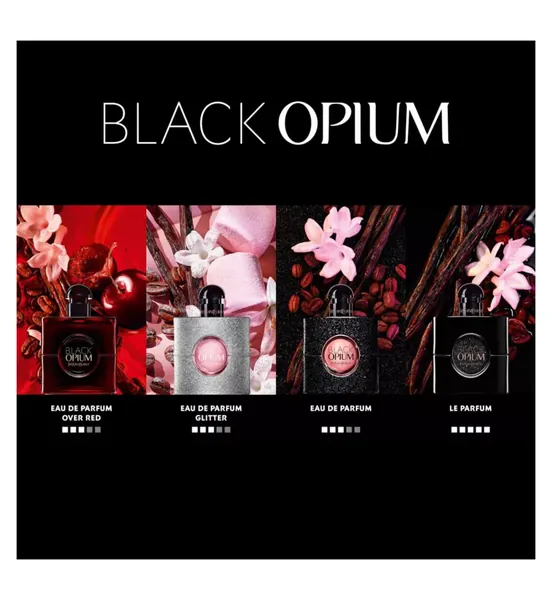 •Black Opium Eau de Parfum Over Red. A thrilling temptation, the signature coffee and vanilla notes of Black Opium Eau de Parfum are twisted with a juicy red cherry accord. Sweet and seductive.