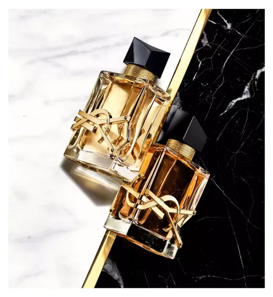 Sharp and elegant like a sculpted silhouette, the LIBRE bottle is embellished with the legendary YSL logo in gold-tone hardware, oversized, bending around the glass.