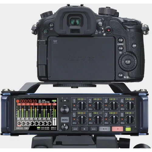 The CMF-8 Camera Mount Adapter from Zoom is an accessory attachment for the Zoom F8 and F8n Multitrack Field Recorders (sold separately). The CMF-8 can be used to securely mount your DSLR camera onto the F8 or F8n recorder via an integrated 1/4"-20 screw. It allows for full recorder access.