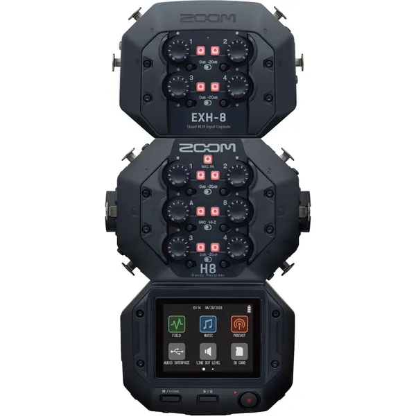 Introduced with Zoom's Capsule System 2.0, the Zoom EXH-8 is a quad XLR input capsule designed for use with your Zoom H8 Handy recorder. With four locking XLR 3-pin inputs, the EXH-8 adds four mic preamps to your H8 for a total of 10 mic inputs.