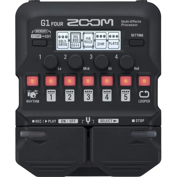 The Zoom G1 Four is a multi-effects processor designed for use with electric guitars. Offered in an easy to use stompbox format, the G1 Four sports a wide selection of effects, amp emulations, and other features, such as an onboard 30-second looper and a chromatic tuner. With 68 built-in rhythm patterns, you can add drum loops to the mix, which can be quite helpful during looping.