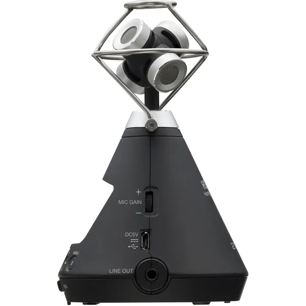 The unified single-knob gain control, LCD screen, and transport/menu buttons deliver easy and efficient device configuration and operation. Remote access to transport controls, levels, and metadata is possible via the iOS H3-VR Control app and optional BTA-1 Bluetooth adapter. An integrated 6-axis motion sensor is utilized to provide automatic detection of the microphone position, which ensures proper audio-to-video orientation alignment and simple angle leveling. Dual 3.5mm outputs with independent level control enable simultaneous connection to headphones and a camera. Record to a microSD/microSDHC/microSDXC card (available separately), or stream audio via USB to a computer or iOS device. The built-in slate function can be used to verbally mark takes and manually align audio and video files.