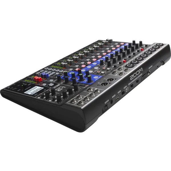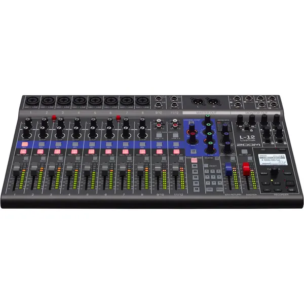 The highly flexible Zoom LiveTrak L-12 is a 12-channel digital mixer and multitrack recorder, well suited for live performances, studio recording, band rehearsals, podcasts, and more. The compact mixer features 8 mono channels, each with combo mic/line XLR-1/4" inputs with high gain, low-noise microphone preamps, +48V phantom power, and a single compression knob, while the two stereo inputs offer dual 1/4" and RCA inputs. Channels 1-2 also offer Hi-Z inputs for connecting guitars and basses. All channels work with the on-board channel strip, which provides a low-cut filter, a 3-band EQ, a pan control, and a send FX for sending signal to the 16 built-in high-quality effects processor with a dedicated EFX Return channel.