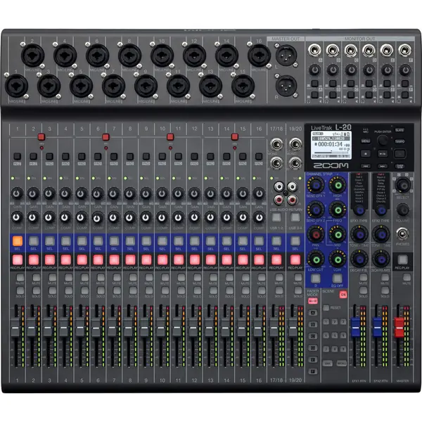 The highly flexible Zoom LiveTrak L-20 is a 20-input digital mixer and multi-track recorder, well suited for live performances, studio recording, band rehearsals, podcasts, and more. The mixer features 16 mono channels, each with combo mic/line XLR-1/4" inputs with high gain, low-noise microphone preamps, +48V phantom power, and a single compression knob, while the two stereo inputs offer dual 1/4" and RCA inputs. Channels 1-2 also offer Hi-Z inputs for connecting guitars and basses. All channels work with the on-board channel strip, which provides a low-cut filter, a 3-band EQ, a pan control, and two send FX for sending signals to the 20 built-in high-quality effects processor with two dedicated EFX Return channels.