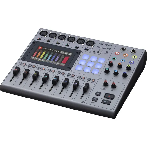 Purpose-built for recording, editing, and producing polished multi-person podcasts anywhere you go without the need for a computer, the Zoom PodTrak P8 is a portable multitrack podcast recorder that lets you quickly record up to six mics, handle 2 echo-free remote call-ins simultaneously, trigger sound samples, and provide separate headphone feeds for all your guests, all at the same time and with refreshing simplicity, thanks to the large full-color LCD touchscreen.